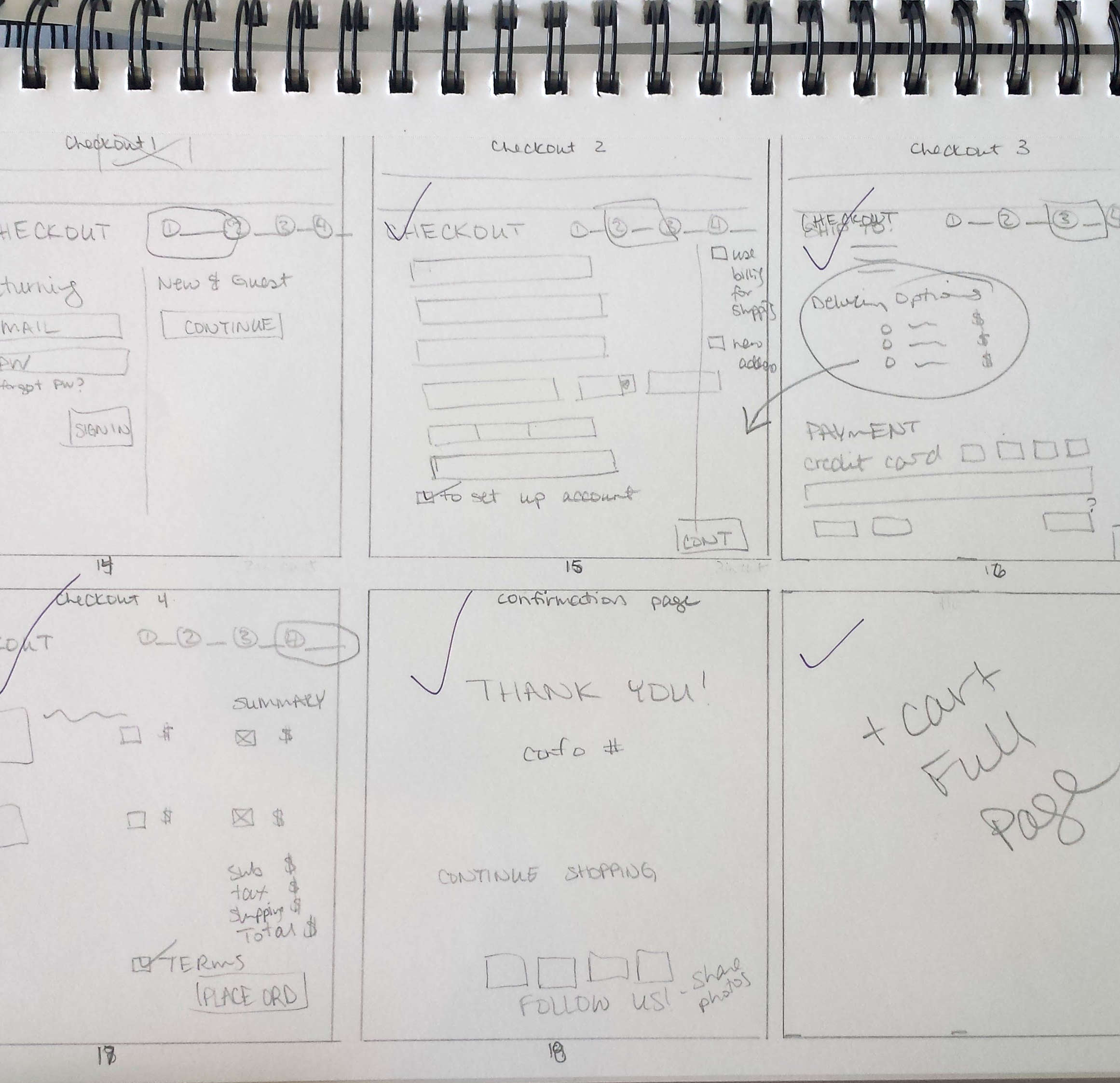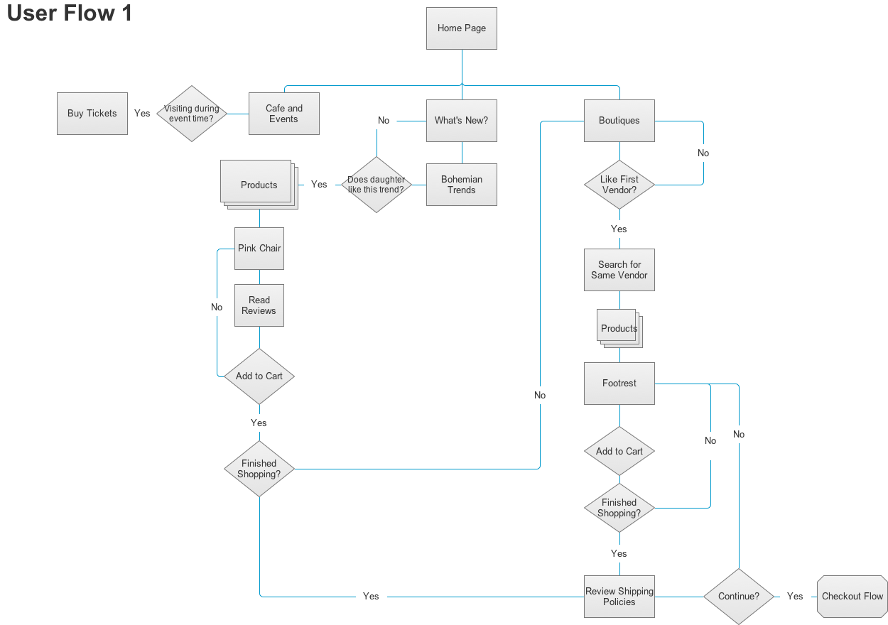 I created three user flows along with a checkout flow using Axure. I wanted to make sure that the navigation for the site would work for any of the three users, event with their different pain points and preferences. For the checkout flow, I used the information gathered in my competitive analysis to streamline the number of pages in the checkout process as much as possible.