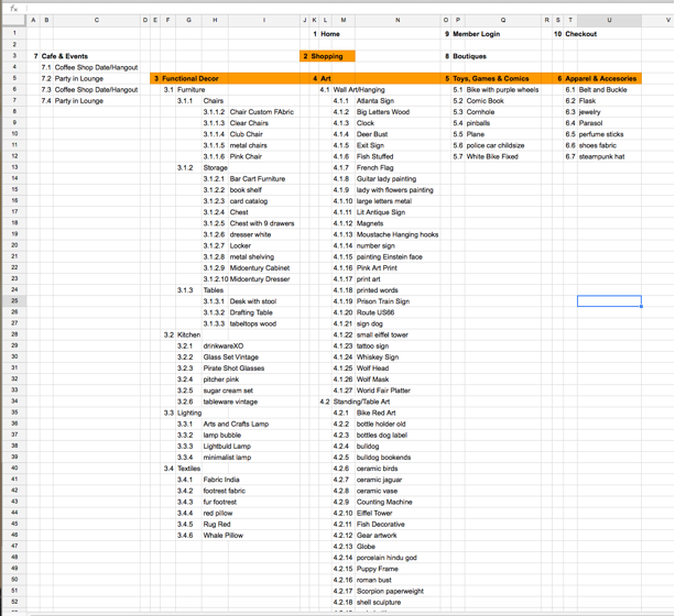 To create the site map, I started with piles from the card sorting exercises and put the information into a spreadsheet, partly so I could track the different results and have a record of it, but also to help in building the site map when I was ready for that stage. I have a lot of experience working in spreadsheets, and it is my go-to tool when I need to sort complicated information.