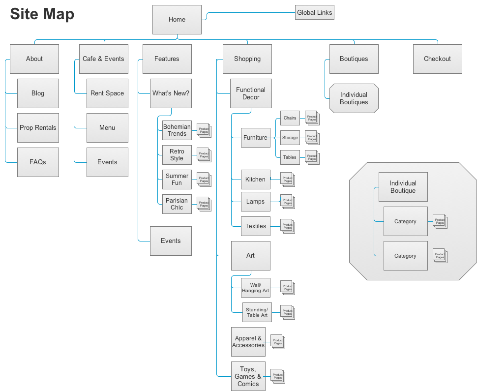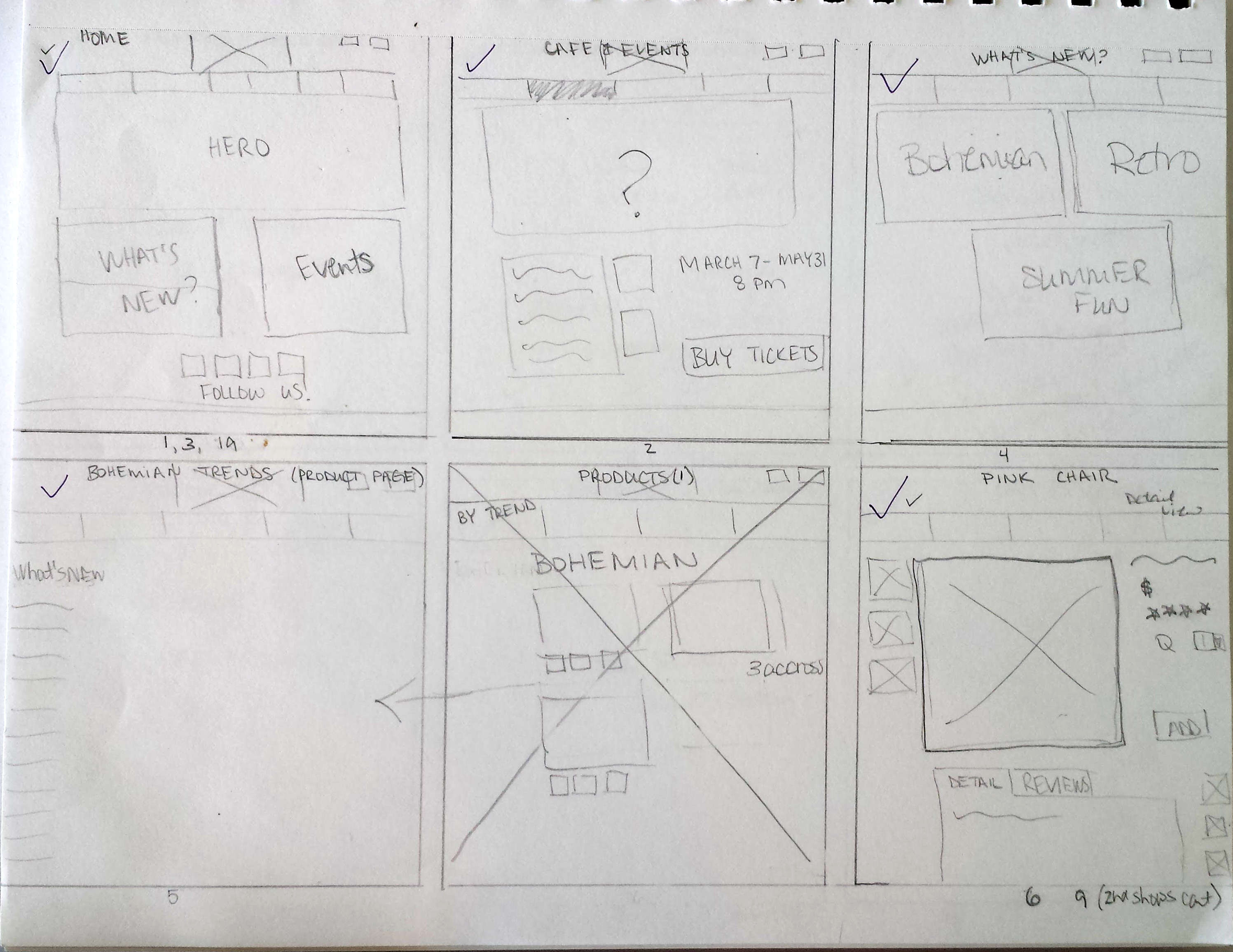 My sketches were done on paper and I wanted to keep as many of the navigational and structural elements consistent throughout the pages so that there wasn't a big change from page to page. Research showed that in addition to shopping by product, it would be important to be able to shop by boutique. During card sorting users commented that there were some types of products or design family that they preferred over others, and would want to be able to search by aesthetic.